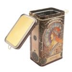 Kaffeburk i plåt med fint Art Nouveau motiv i relief från Alphonse Mucha. Burken har tättslutande lock med gångjärn och rymmer ca 450 gram kaffe. Mått 11x18x7,4 cm (bxhxd). Handdiska och torka noggrant.