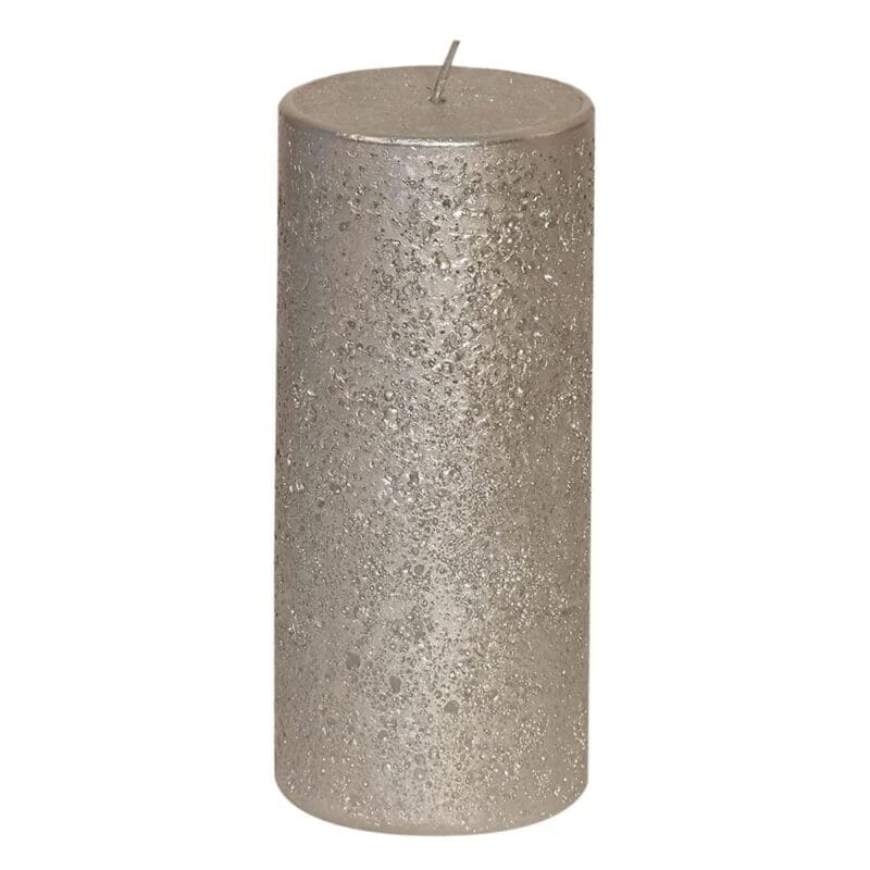 Blockljus med rå metallicfärgad yta. Diameter 6,8 cm, höjd 15 cm. Brinntid ca 49 timmar.