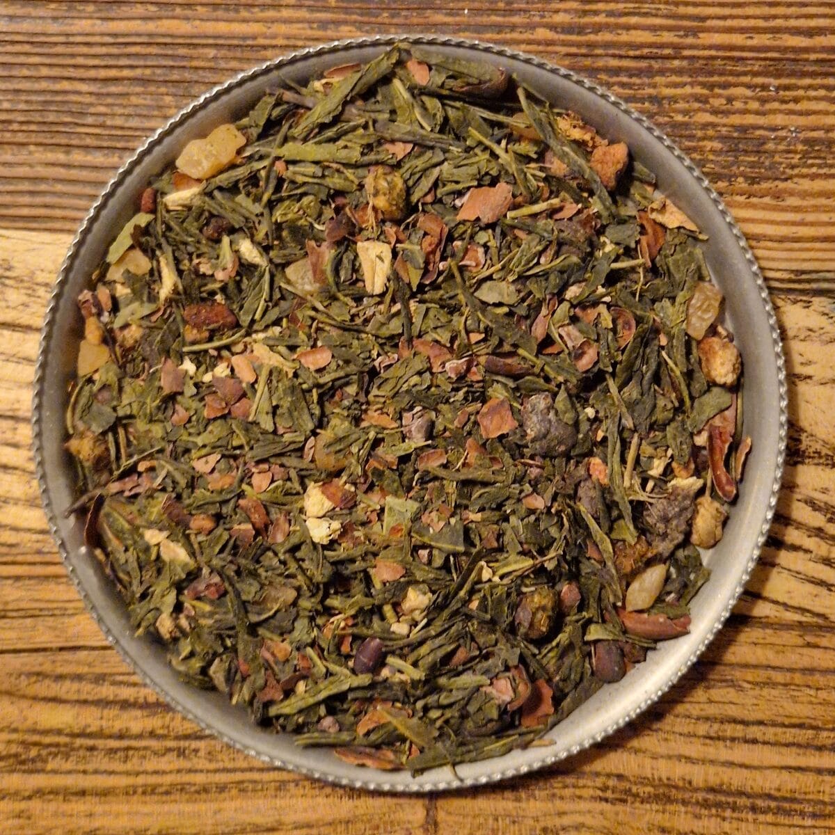 Grönt te med smak av päron och choklad, förfinat med kanderad ingefära. Kakaoskal och fruktbitar gör blandningen till en festlig njutning.