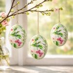 De friska gröna tonerna tillsammans med de rosa detaljerna ger en pigg och livfull känsla som verkligen signalerar vår. Perfekta att hänga i björkris eller på en gren i en glasvas.