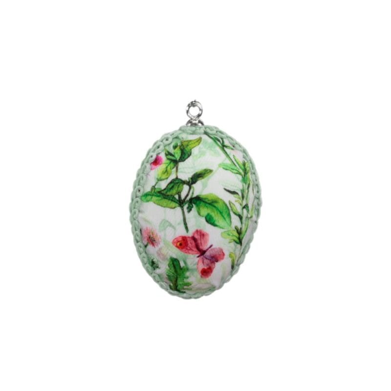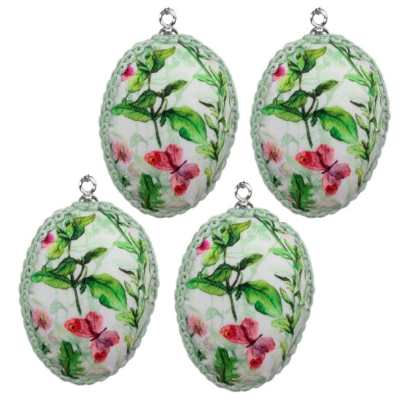 Dekorativa påskägg klädda i ljust tyg med botaniskt mönster av gröna blad, blommor och fjärilar. Den mjukt flätade textilkanten ramar in motivet och ger äggen ett genomarbetat och omsorgsfullt uttryck. Säljs i set om 4 stycken.