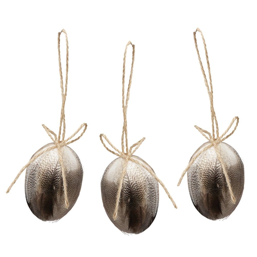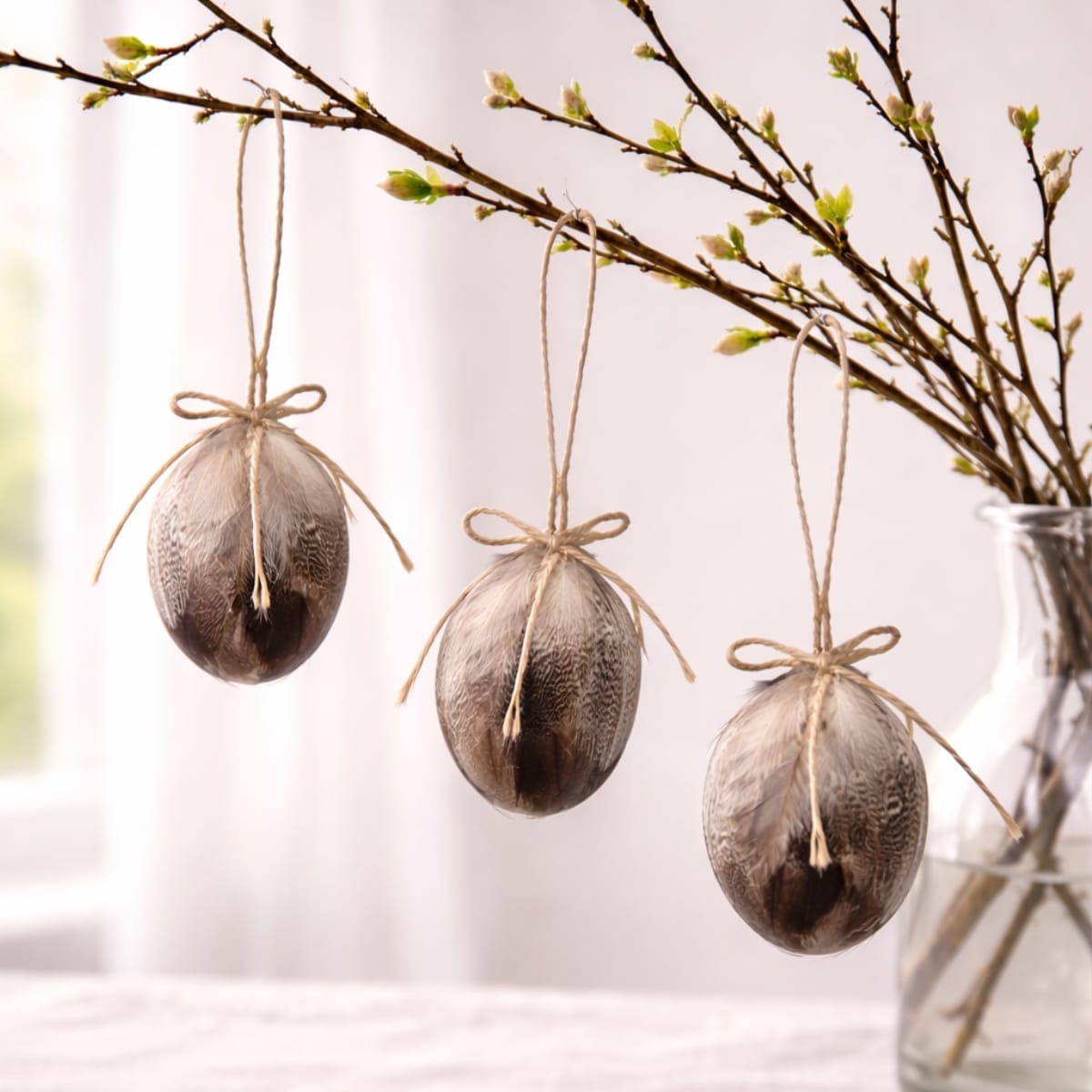 Hängdekoration i form av fjäderprydda ägg som ger en naturlig och rustik känsla till påskens dekorationer. De mjukt tonade fjädrarna och det enkla jutesnöret skapar ett mjukt och jordnära uttryck.