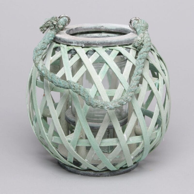 Grön ljuslykta i trä med glasbehållare och rephandtag. Diameter 12 cm, höjd 19 cm.