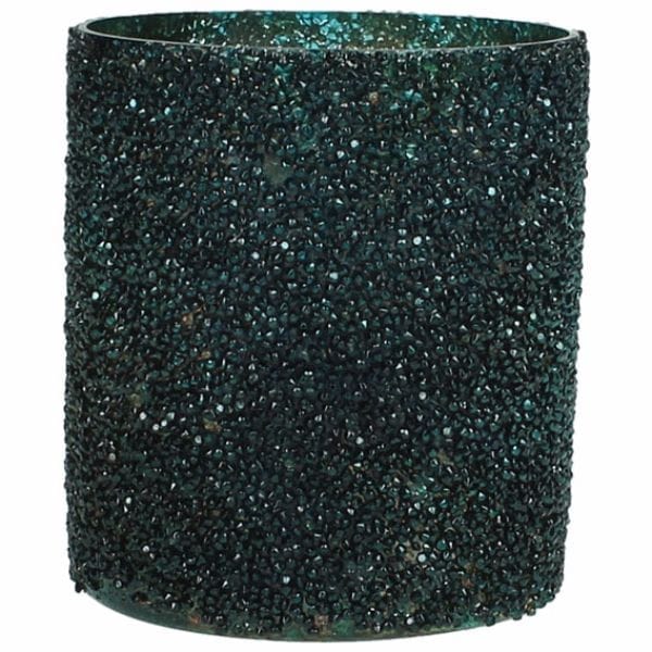Ljuslykta i glas med en mörk svart ton och en elegant dragning åt petrol. Den råa, strukturerade ytan skapar ett levande ljusspel när värmeljuset är tänt och ger ett varmt, mjukt sken i rummet.