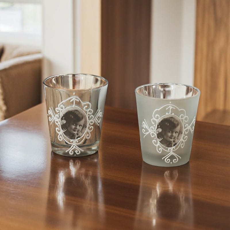 Ljuslyktor i glas, silverfärgade, en matt och en blank, dekorerade med en söt bild. Höjd 10 cm, diameter 9 cm. Priset avser ett par, en matt och en blank ljuslykta.