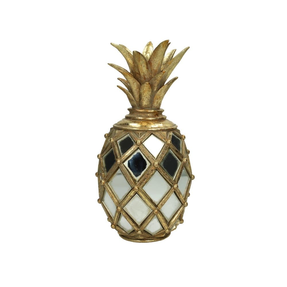 Ljusstake i form av en ananas i guldfärgad polyresin med dekorativt spegelglas. Diameter 12 cm, höjd 24 cm.