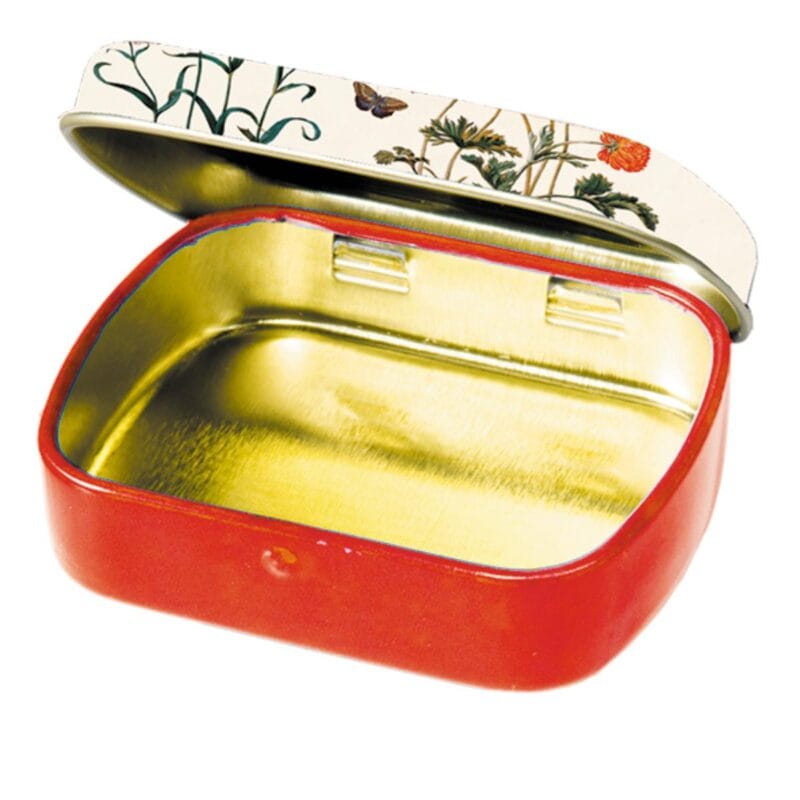 Liten ask i plåt med fint mönster av Maria Sibylla. Asken har uppfällbart lock och måtten 6,3×1,8×5,2 cm.