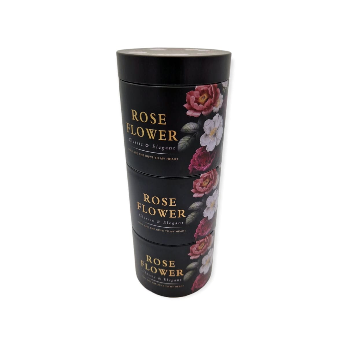 Plåtburk i tre delar med ett lock och vackert blomstermotiv. Mått hela stapeln: höjd 22,5 cm och diameter 8,5 cm.