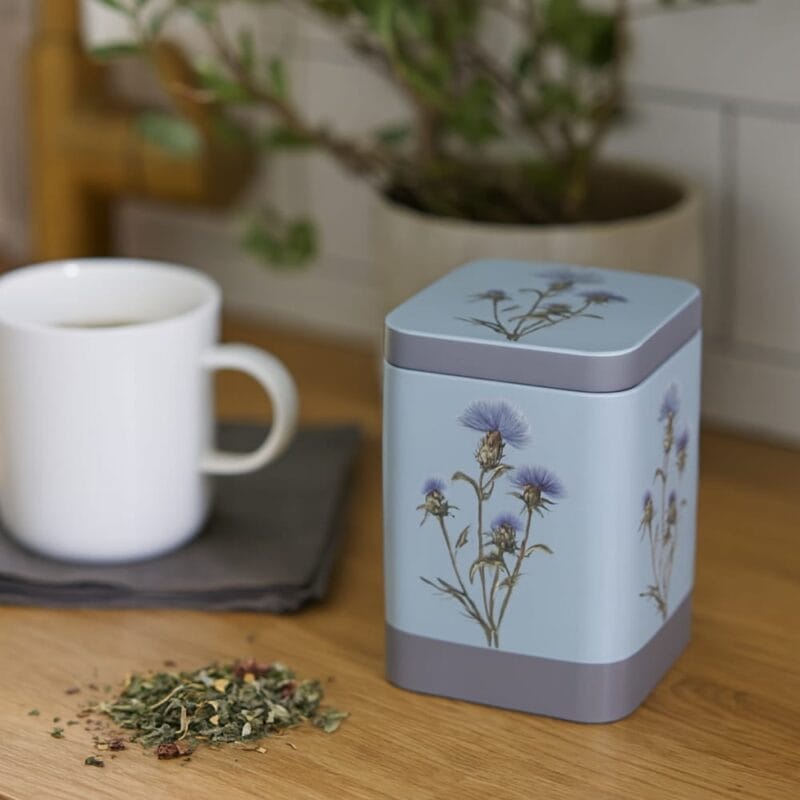 Vacker teburk i plåt med motiv av tistelblommor, inspirerad av de skotska högländernas natur. Den dova blå tonen i bakgrunden framhäver de detaljerade blommorna och ger burken en dekorativ och harmonisk känsla.