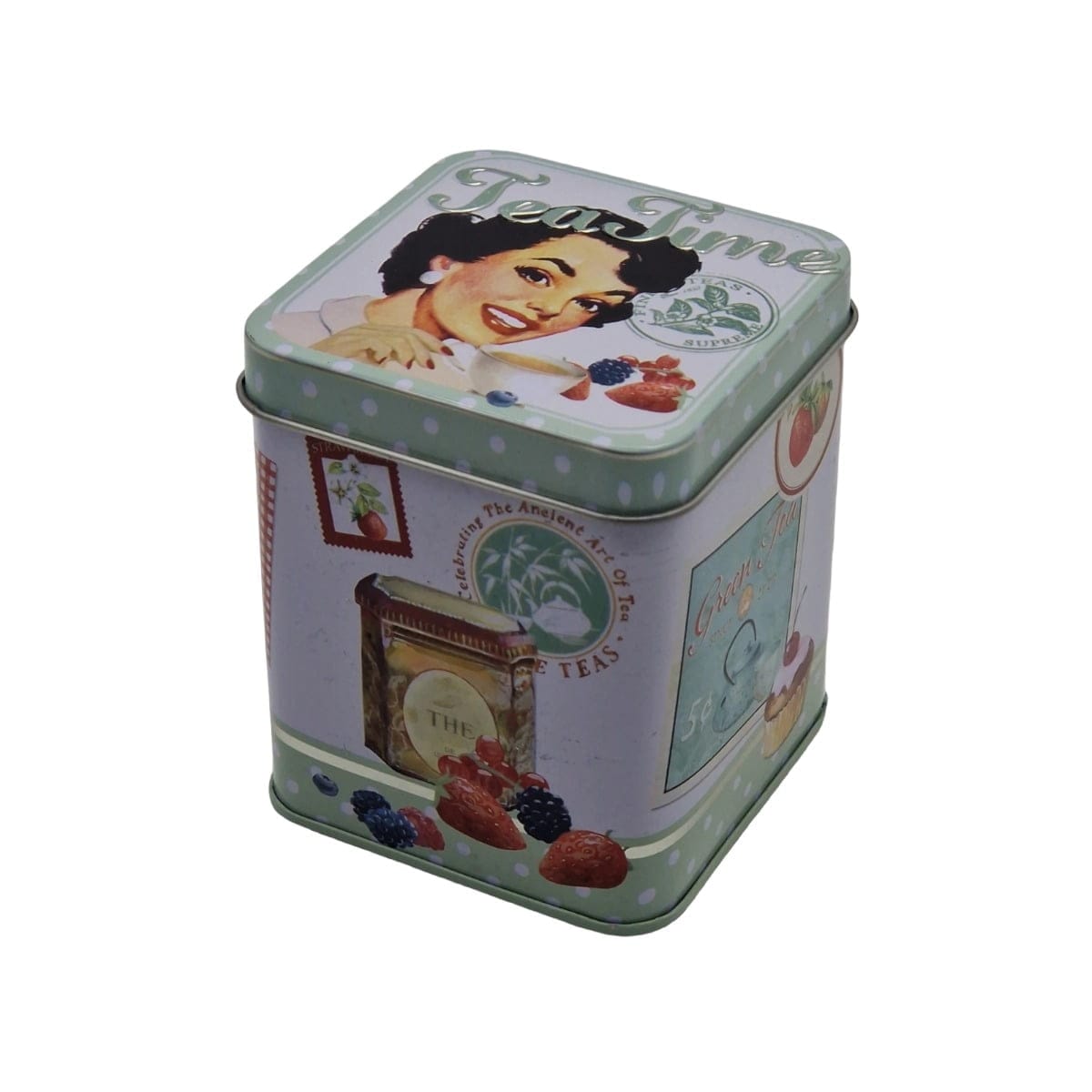 Teburk i plåt med fint motiv. Burken rymmer cirka 100 gram te. Mått 7,5×7,5×9 cm (dxbxh).