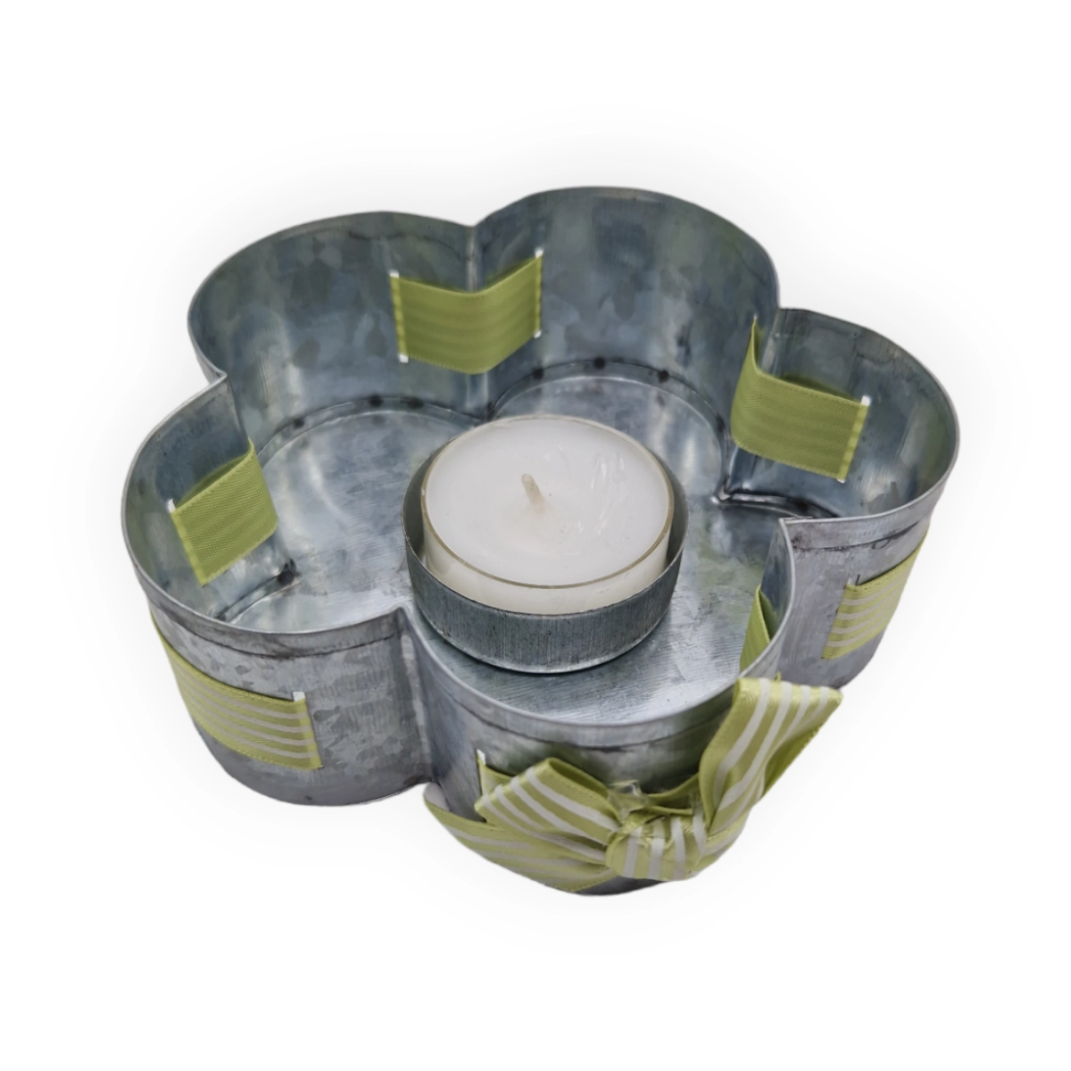 Hållare för värmeljus i form av en blomma i zink. Mått: 11,5×11,5×4 cm (lxbxh).