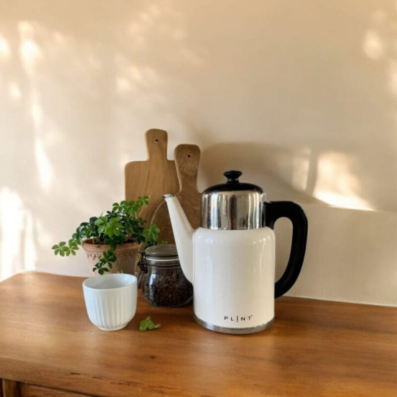 En praktisk och riktigt snygg elektrisk vattenkokare i härlig retrostil från danska PLINT. Vattenkokaren har dubbelväggfunktion vilket gör att vattnet håller sig varmt under en längre tid. Du kan även ta med dig vattenkokaren till bordet och använda den som termos. Dessutom har du möjlighet till temperaturval, där du kan hålla vattnets temperatur på 60°, 75° eller 90° när det står i kannan. Praktiskt när du t ex ska dricka grönt eller vitt te där vattnet inte får vara 100 grader.